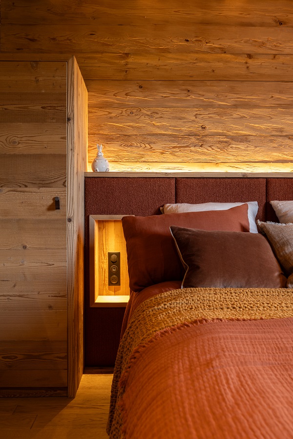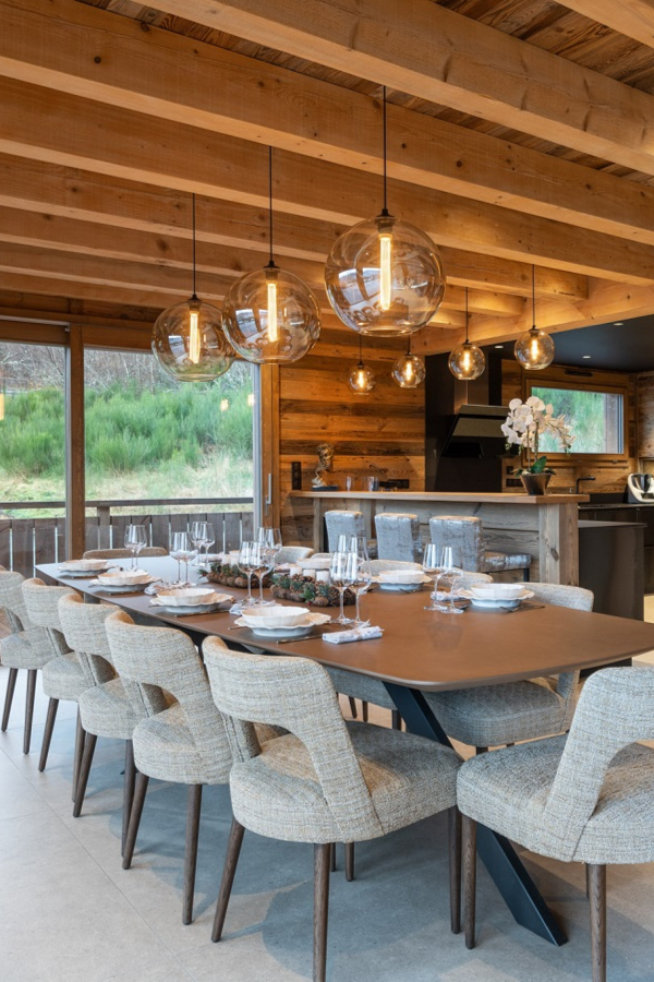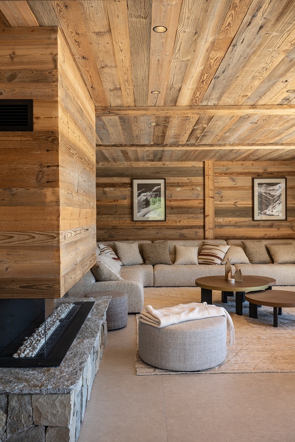 À l'intérieur, le chalet dégage une atmosphère à la fois chaleureuse et moderne. Le vieux bois, apporte une touche d'authenticité, tandis que la décoration contemporaine, avec ses lignes épurées et ses matériaux nobles, crée un contraste saisissant. Les espaces de vie sont soigneusement agencés pour favoriser la convivialité. Un grand salon, orné d'une cheminée en pierre, invite à la détente, tandis que la décoration moderne et sobre ajoute une note d'élégance.