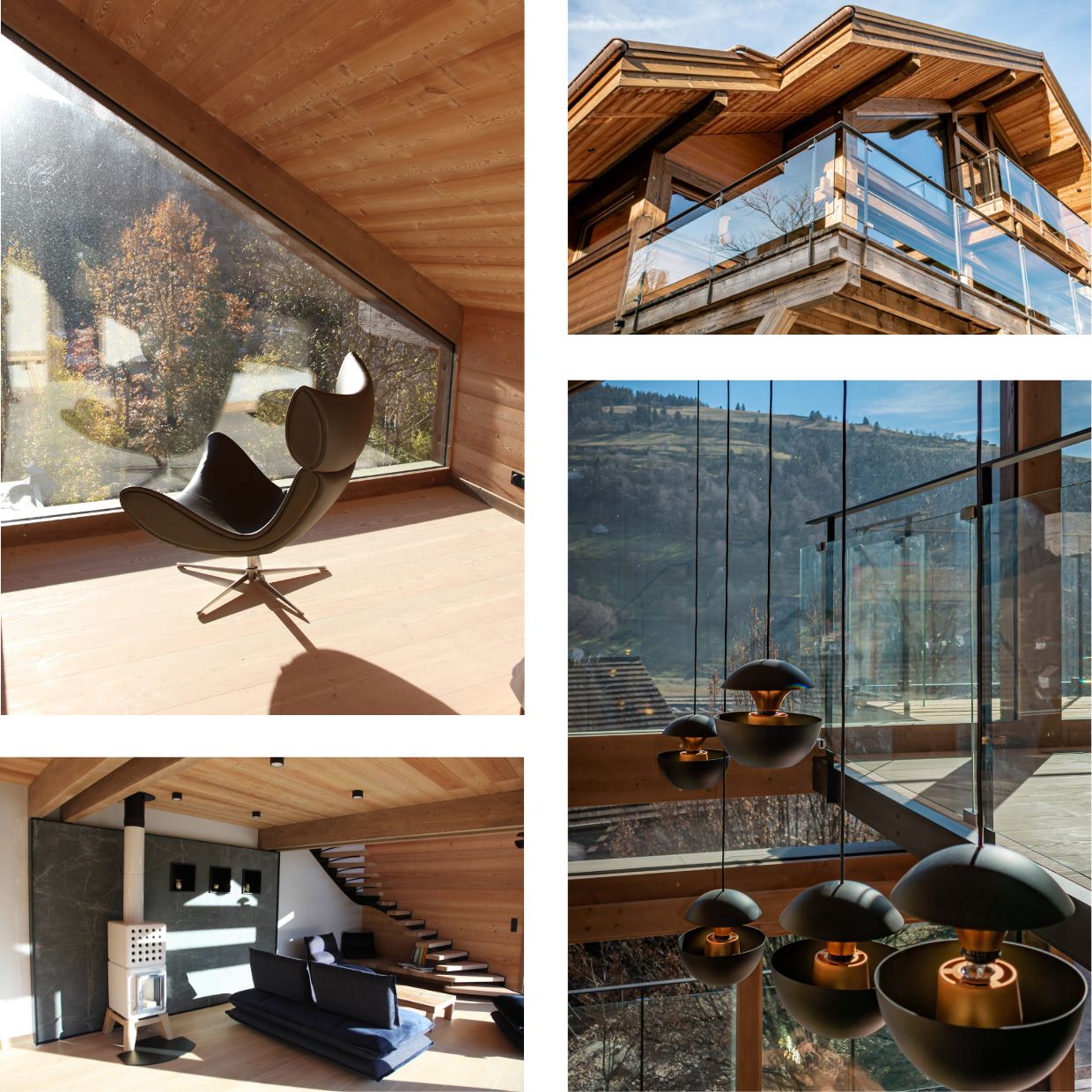 À l'intérieur, le chalet dégage une atmosphère à la fois lumineuse et chaleureuse. Le bois s'harmonise élégamment aux larges baies vitrées et au mobilier contemporain, créant un espace élégant et moderne, où chaque détail invite à la détente à et la contemplation.